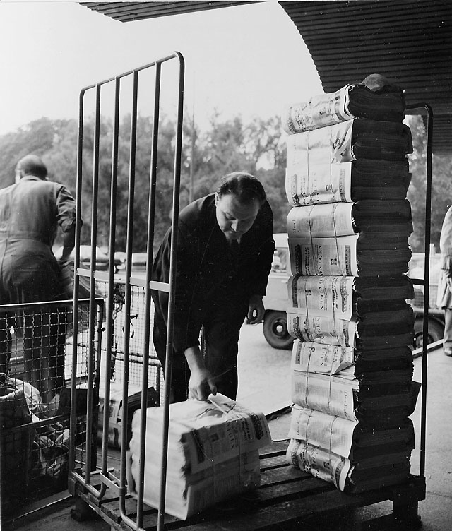 Omlastning till bil från pall med Grythyttan-stöd. Varje bunt