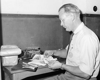 Lantbrevbäraren Erik Johansson Åkersberga räknar sin kassa efter turen.
