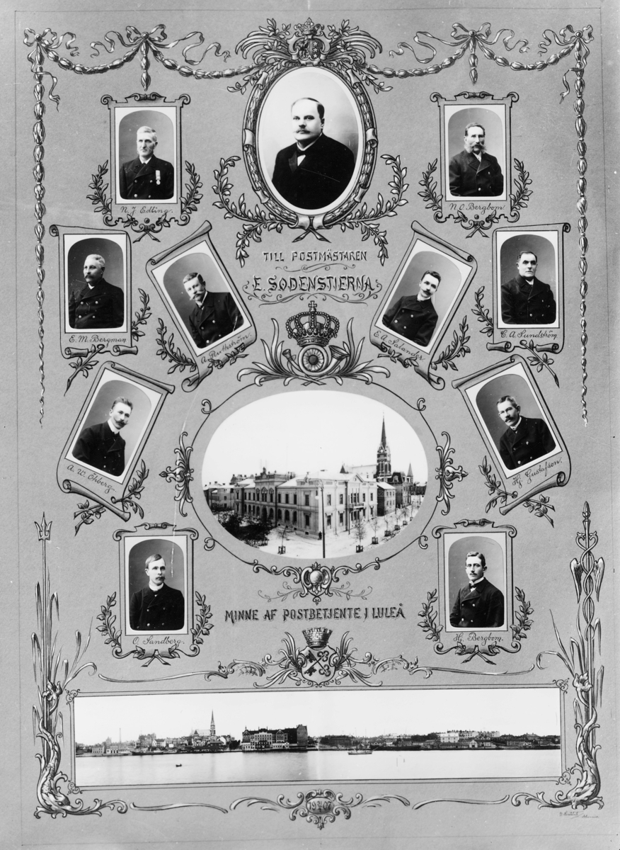 Hyllningsadress till postmästaren E. Sodenstierna i Luleå från postbetjänterna i Luleå, 1907.