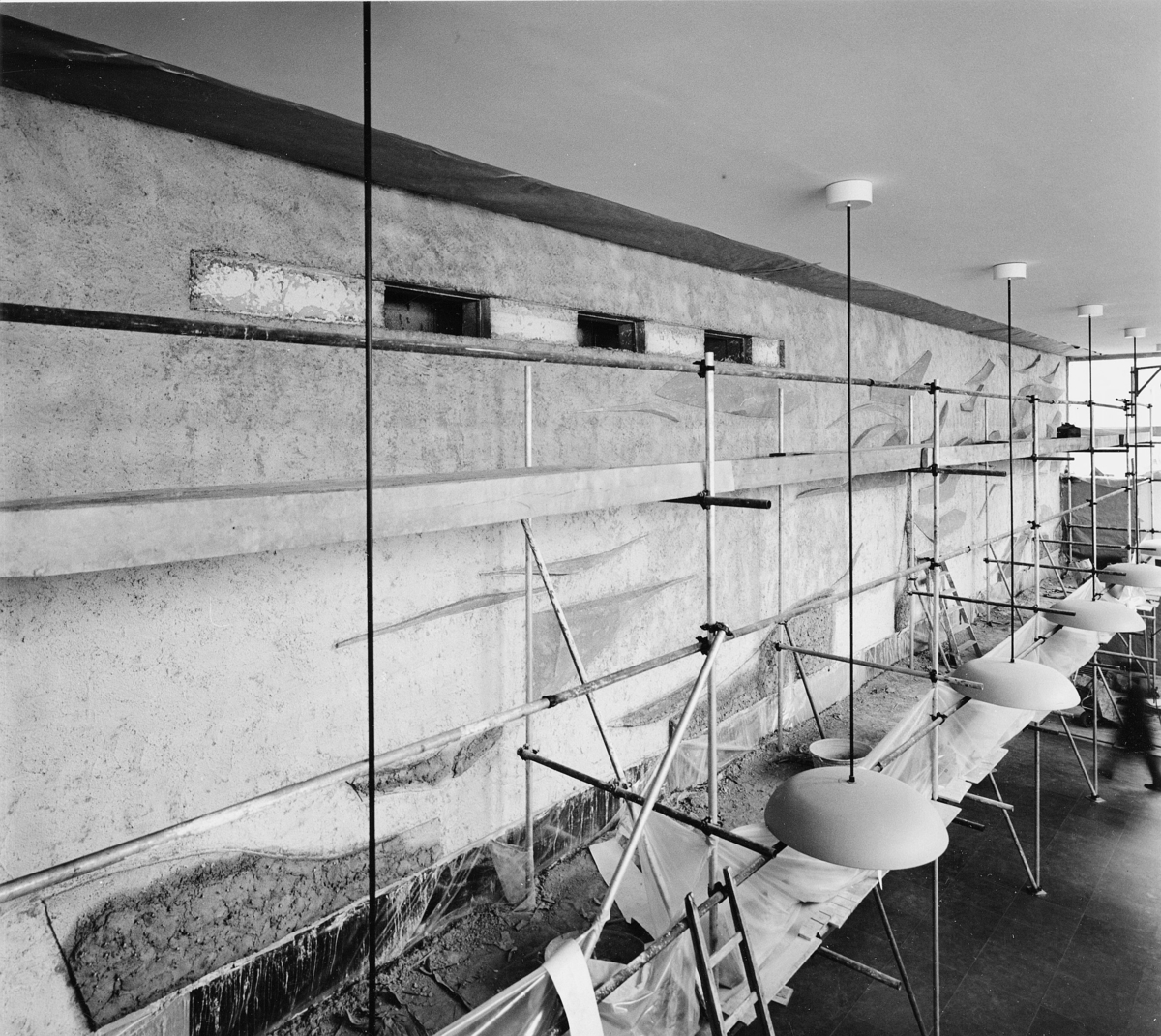 Den blivande väggreliefen sedd från trappan till entréhallens övre plan.