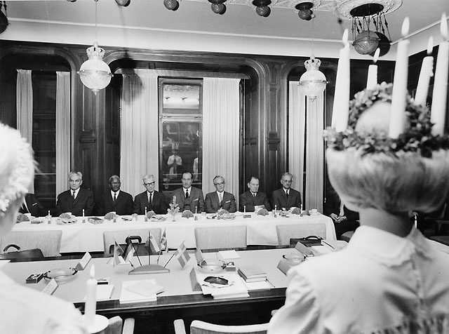 Arbetsgruppen lyssnar till Lucia och hennes tärnor när de sjunger.