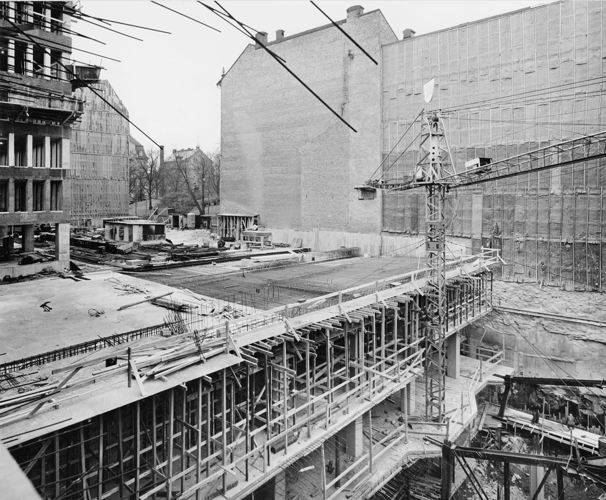 I förgrunden bottenvåningen och garagevåningarna i huset Rådmansgatan 65. I huset skall inrymmas postverkets läkarcentral. I fonden skymtar Tegnérlunden.