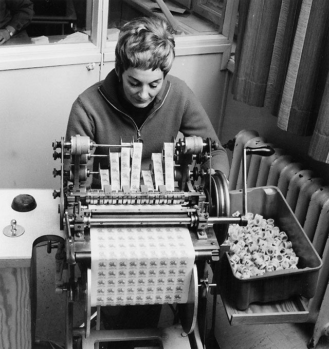 Sista fasen vid tillverkningen av frimärksrullar. Frimärksbanan