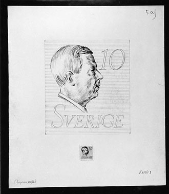 Bidrag till 1951 års tävling om ny frimärkstyp med Gustaf VI Adolfs porträtt. Konstnär: Bertil Kumlien. Motto: Kursiv "1" + "2". Foton 29/5 1967. "Kursiv 1". (Spegelvänd profil).