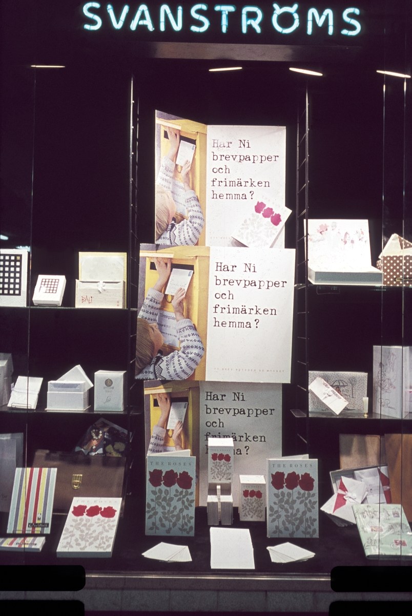 Fönsterskyltning med brevpapper och dylikt i Svanströms fönster i T-banehallen, i första höghuset, Sveavägen 17,
