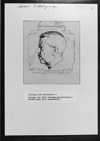 Bidrag till 1951 års tävling om ny frimärkstyp med Gustaf VI Adolfs porträtt. Konstnär: Mark Sylwan, med motto: "I stålgravyr". Tillägg till alternativ 5. Blyerts.