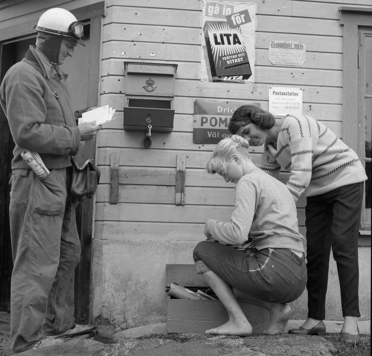 Lantbrevbärare Österberg, motorcykelåkande, lämnar och hämtar posten vid handelsboden i Löka. Vid den "gemensamma" brevlådan hämtas posten av Britt-Marie Tornvall (t.v.) och Karin Pielecke från Köln.
