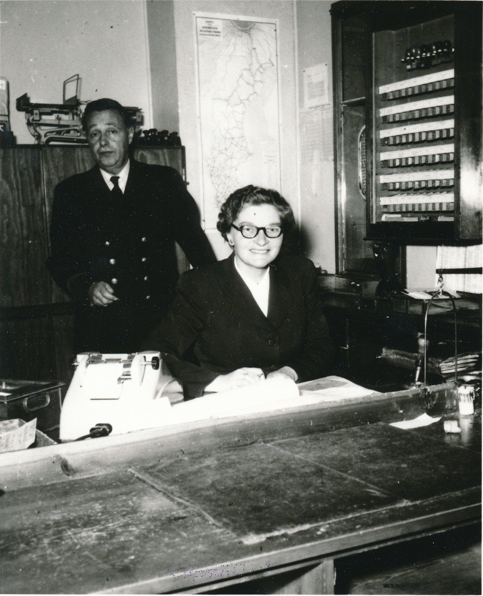 Postkontoret Sölvesborg 3. Fotografi med motiv av postbiträdet Sonja Svensson vid sitt arbetsbord.