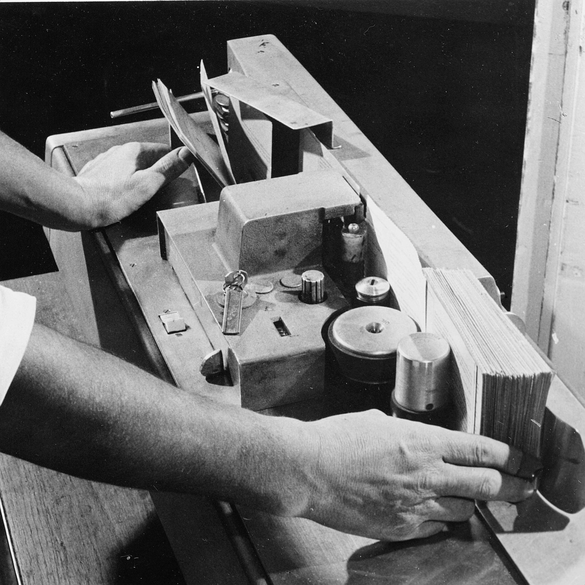 Girobokföringen. Färdiga utbetalningskort stämplas i maskin.