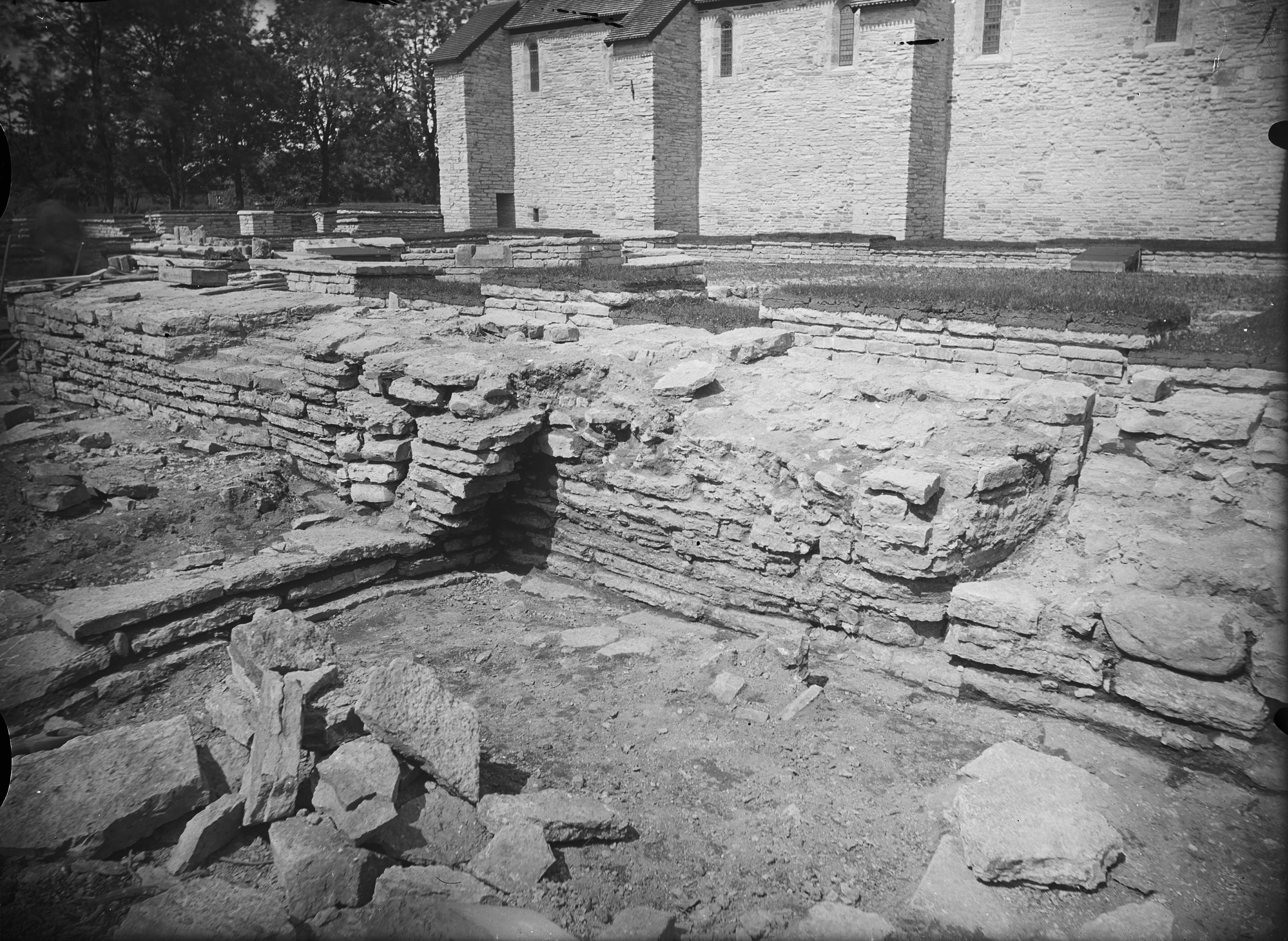 Västra delen av muren mellan refektoriets förrum och östra längans östligaste del. Till höger en igenmurad dörröppning. Murens påmurning borttagen. Från sydöst.