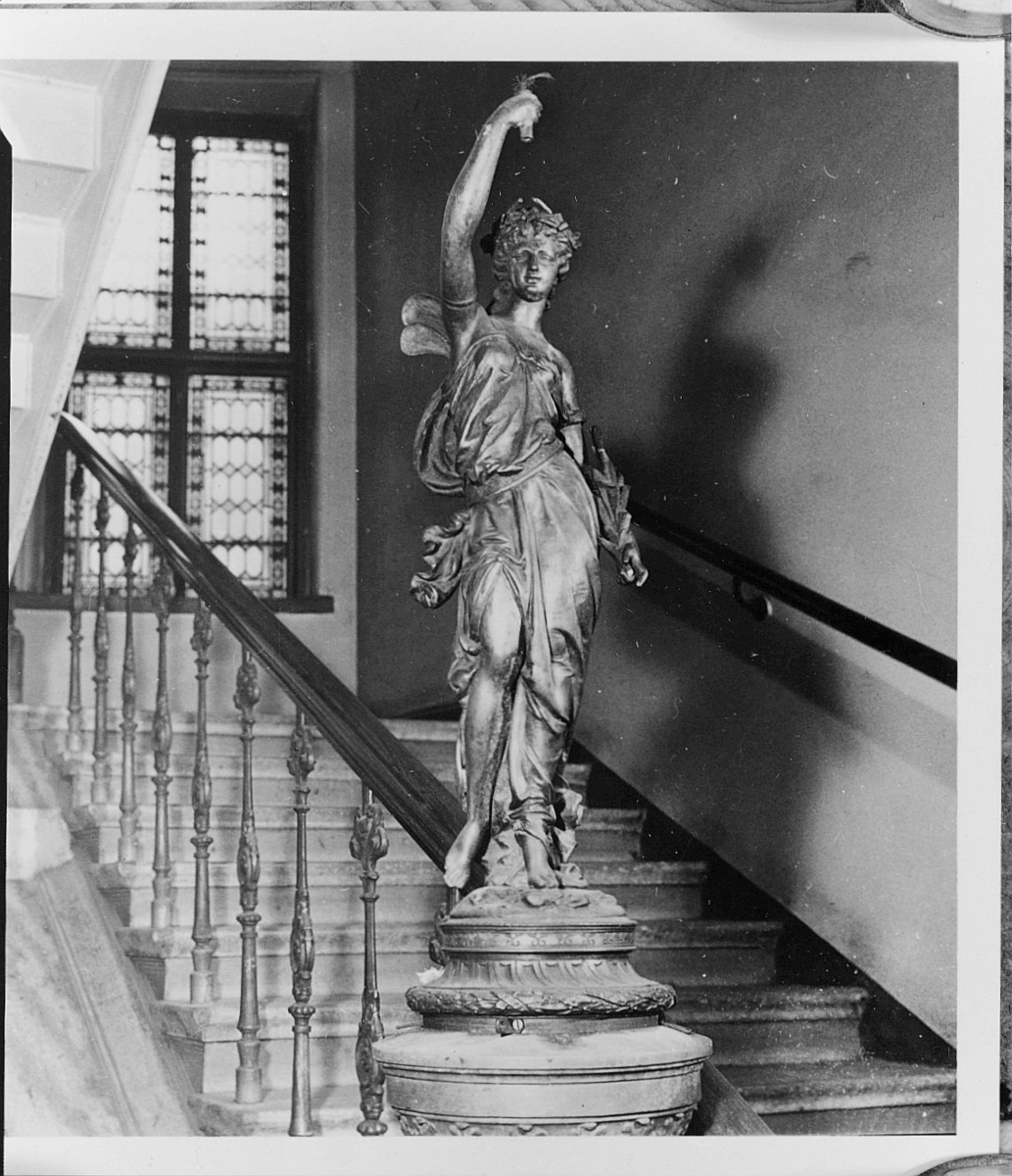 Skulptur i trapphuset, troligen i fastigheten i hörnet av Drottninggatan-Tegnérgatan, med entré från Drottninggatan 87. I fonden syns målade glasfönster i trappan. Fastigheten revs för nya Postbankshuset. Foto 1959.