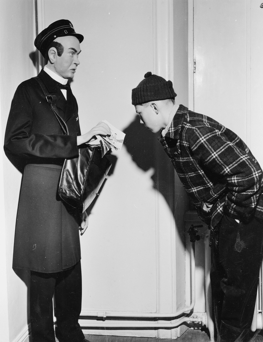 Brevbärarförman från 1900-talets början med väska och julkort.