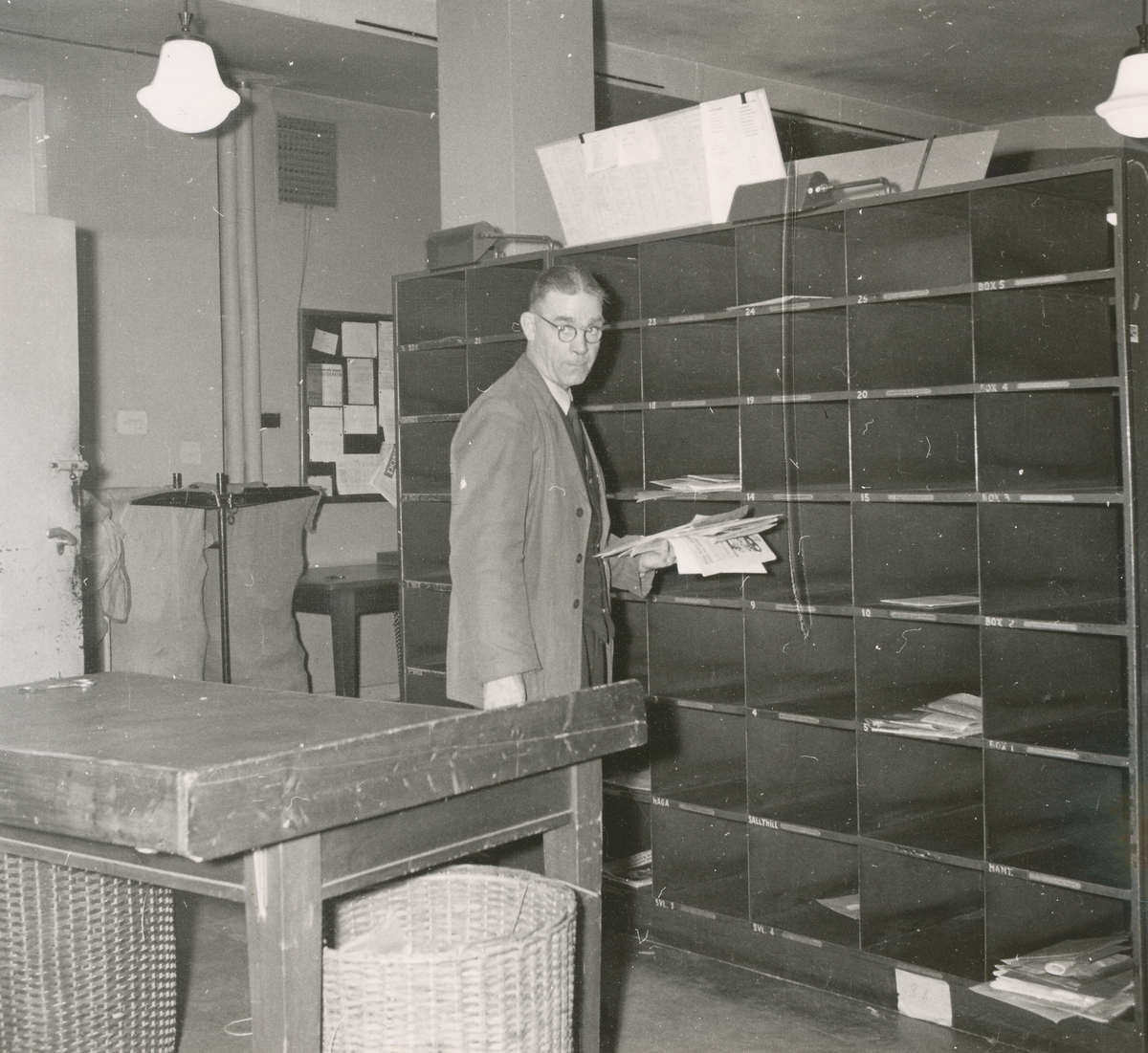 Brevbärarexpeditionen i Sundsvalls postkontor, försortering av korsband. Brevbärarförman E. Höglund.