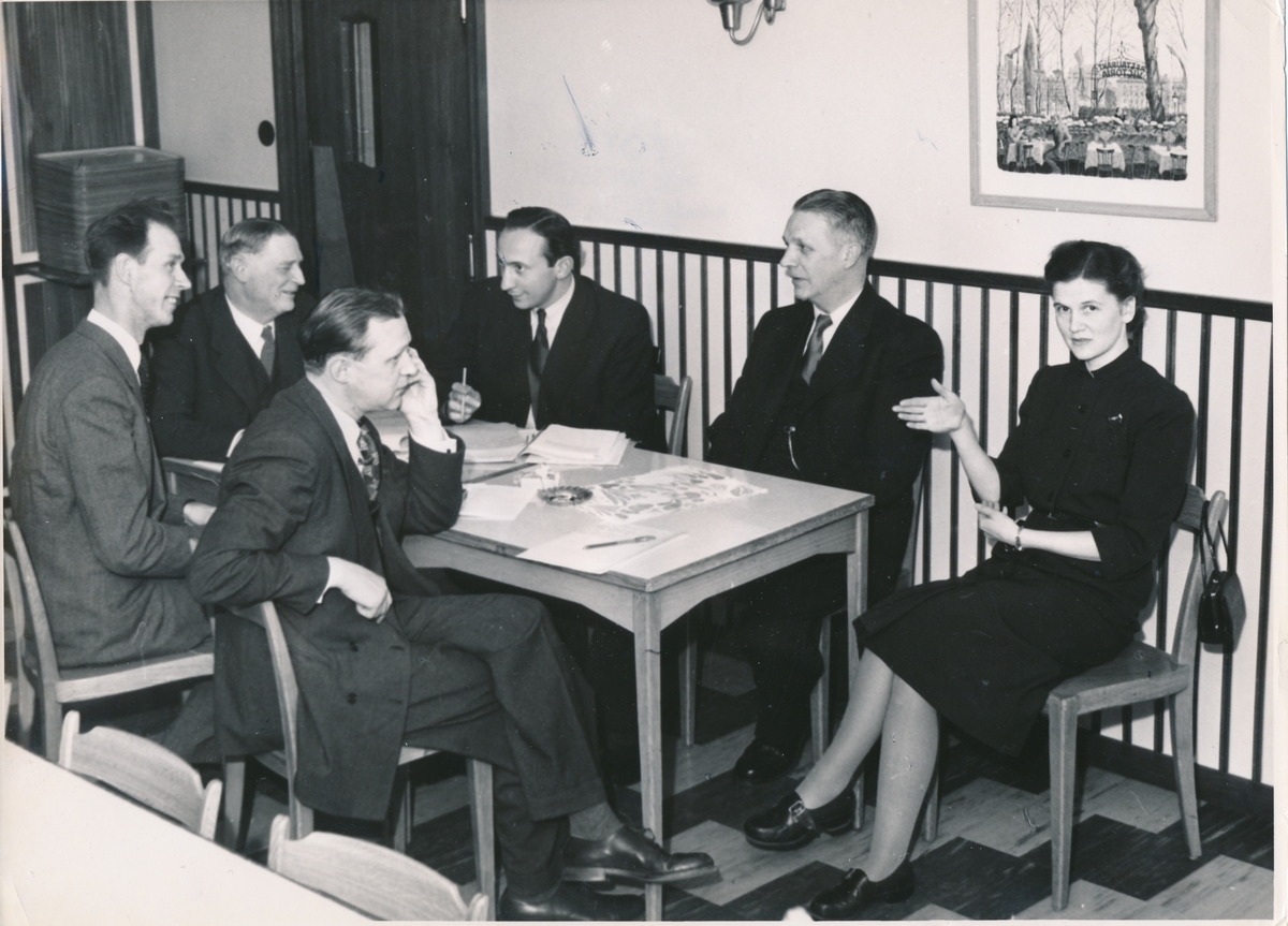 Fotografi föreställande företagsnämnderna i Bromma. Bilden är tagen i samband med sammanträdet för företagsnämnderna i Bromma, Hägersten och Johanneshov, vid Postkontert Johanneshov 1, 1952.