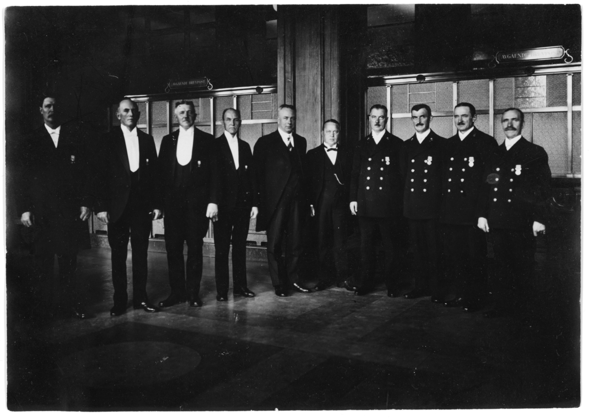 Fotografi taget i samband med utdelning av medalj för nit och redlighet i statens tjänst. Andra man från höger Axel Emil Ahlqvist.