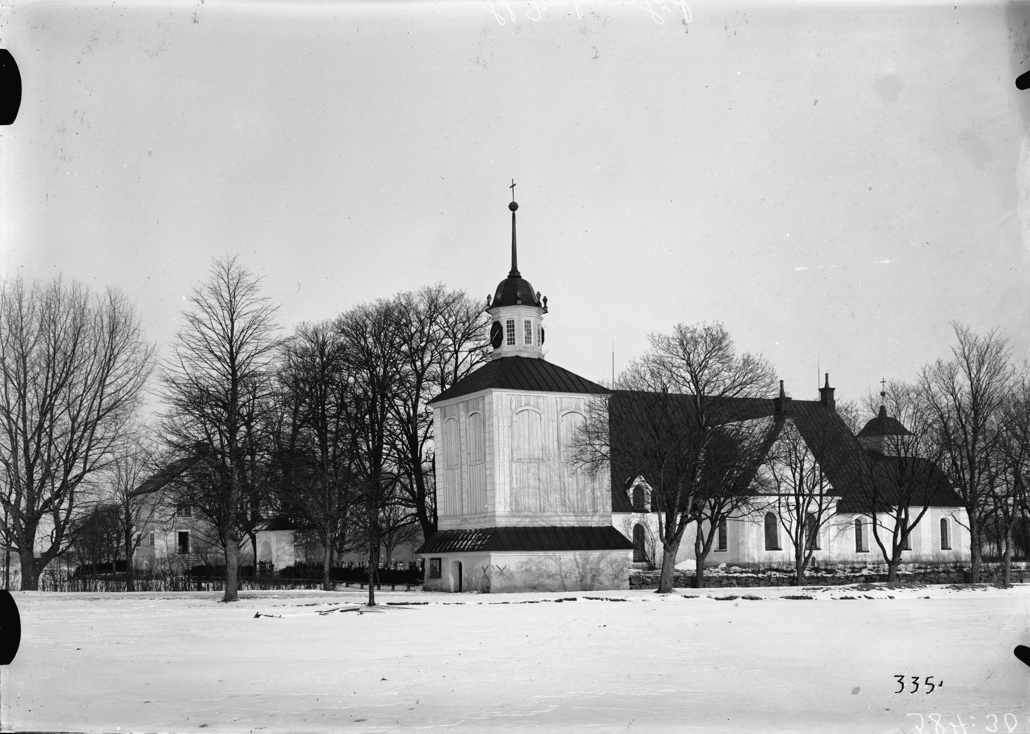 Kyrkan, klockstapeln och sockenmagasinet mot sydväst.