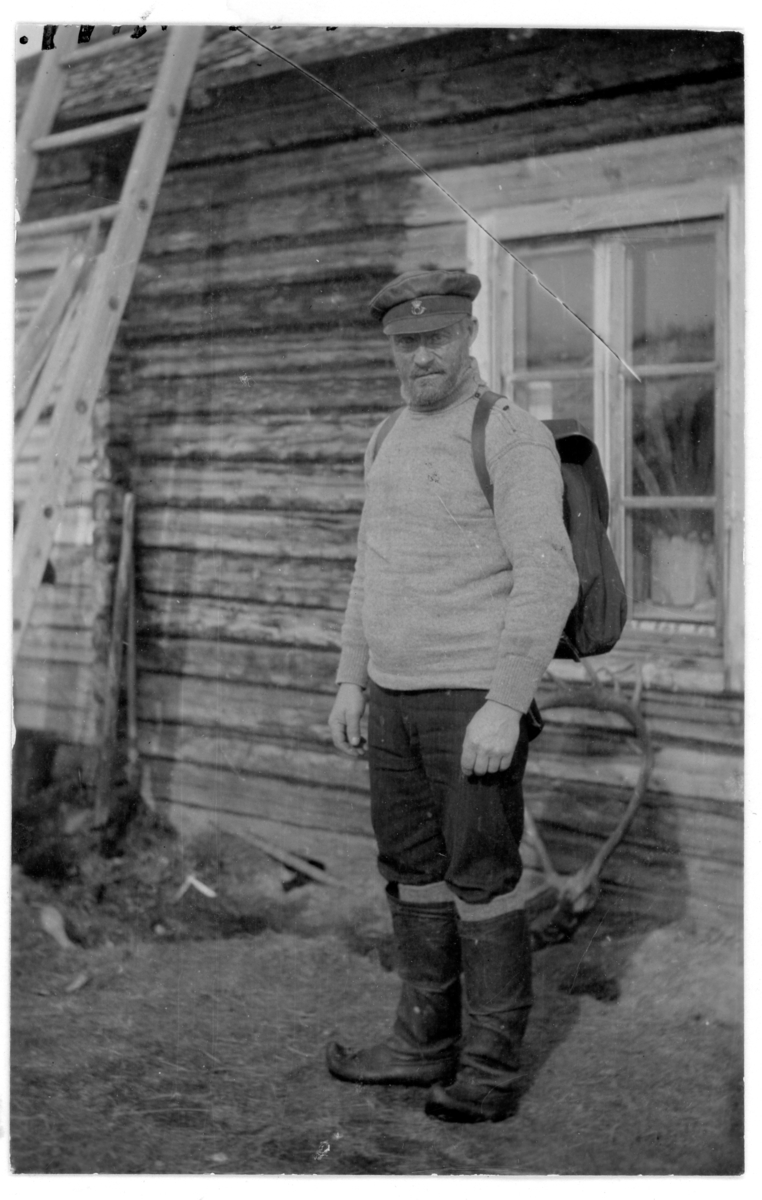 Titel: Lantbrevbäraren J.K.A. "Posti-Kalle" framför sin stuga.