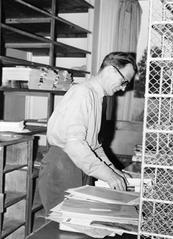 Lantbrevbärare i Täby förarbetar posten, på postexpeditionen, före brevbäringsturen.