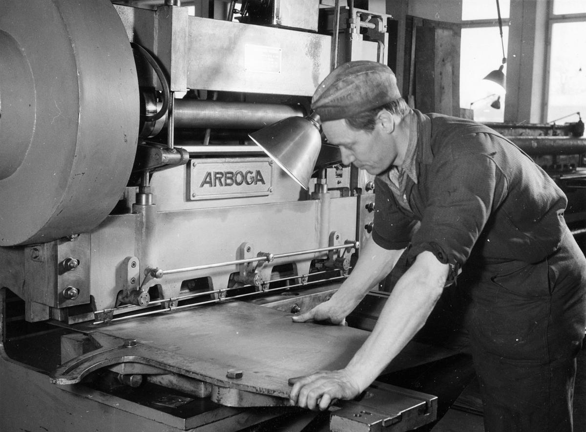 Stålmöbelverkstaden. Postboxfack. Gustavsson klipper plåten.