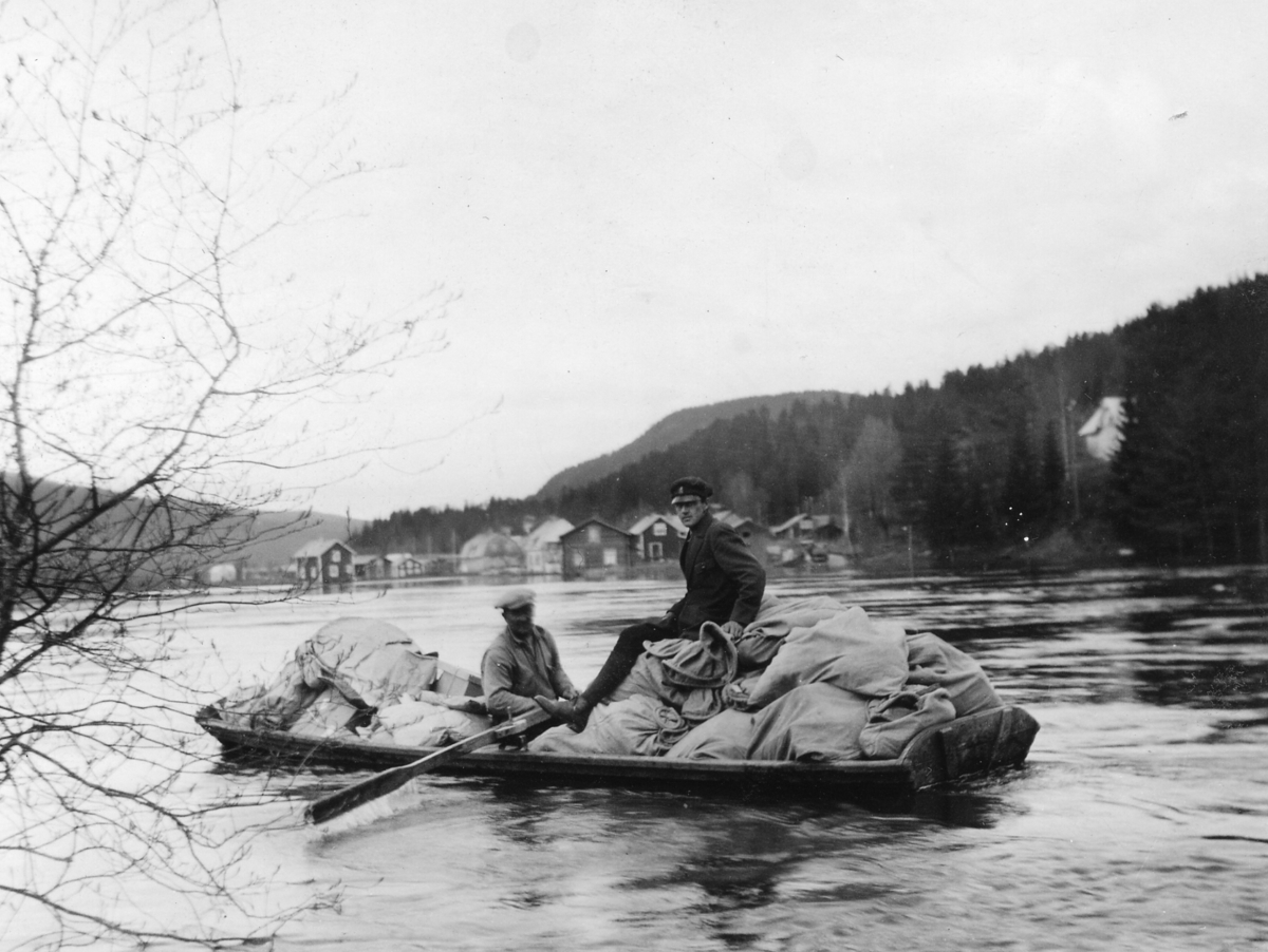 Posten befordras med båt över Klarälven vid Fastnäs färjeställe. Färjan kunde inte användas på grund av för högt vattenstånd.