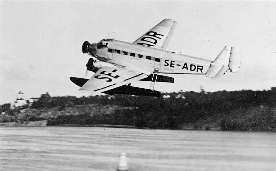 Postflygplan ABA:s "SE-ADR" , typ Junkers, på linjen Stockholm - Helsingfors, startar från Lindarängen i Stockholm.