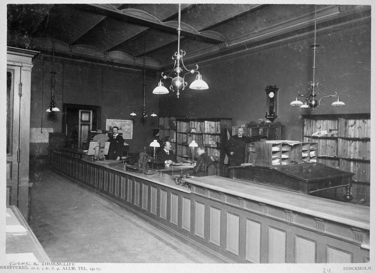 Paketavdelningen, inrymd i Konstakademiens hus, bottenvåningen ut mot Rödbodtorget. 1903.