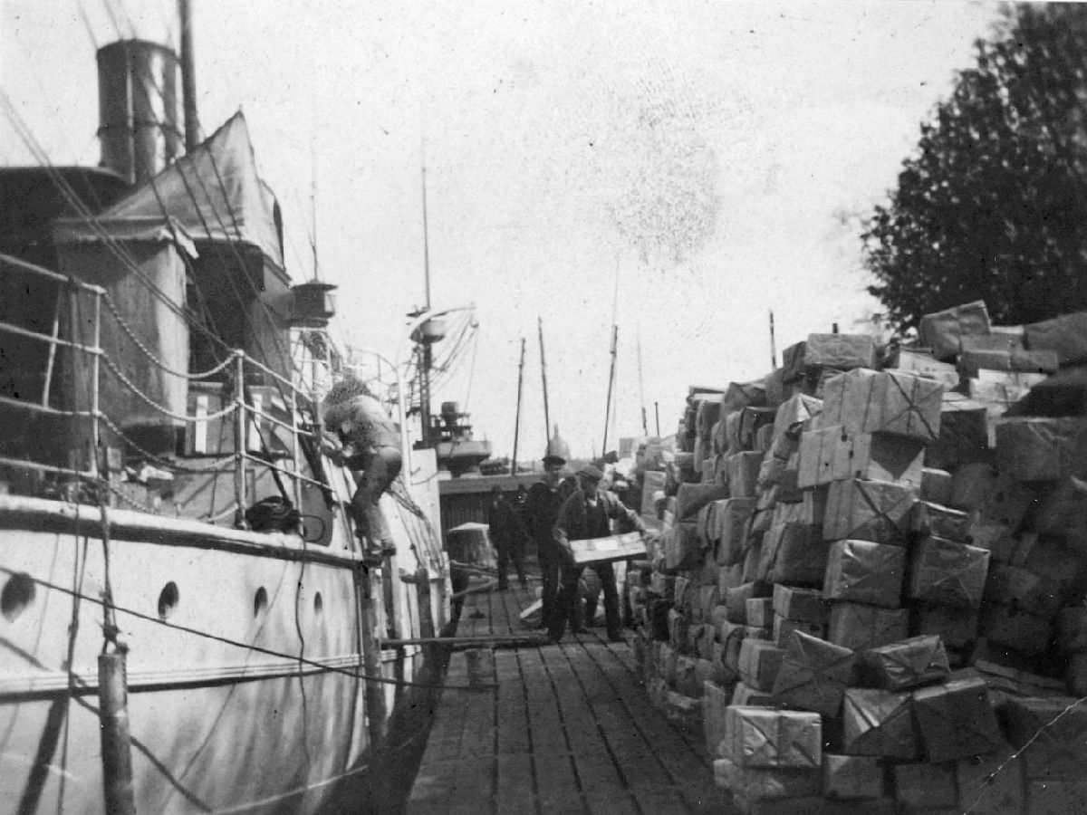 Titel: Transitopost på kajen i Gävle. Postångfartyget Öland.