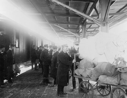 Avlastning av post från postboggievagn vid Stockholms
