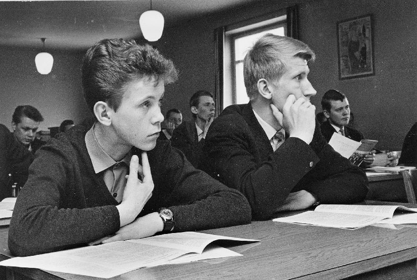 Uppmärksamma åhörare, i undervis-ningslokalen på Stockholm Ban, är Arne Willman, Gäddede, jobbande i Roslags Näsby (t.v.) och B.I.Johansson, Ljusdal, nu i Bromma.