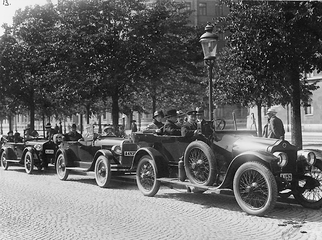 Titel: Bilkortegen på Strandvägen. Fru Flodman är ciceron i första bilen.