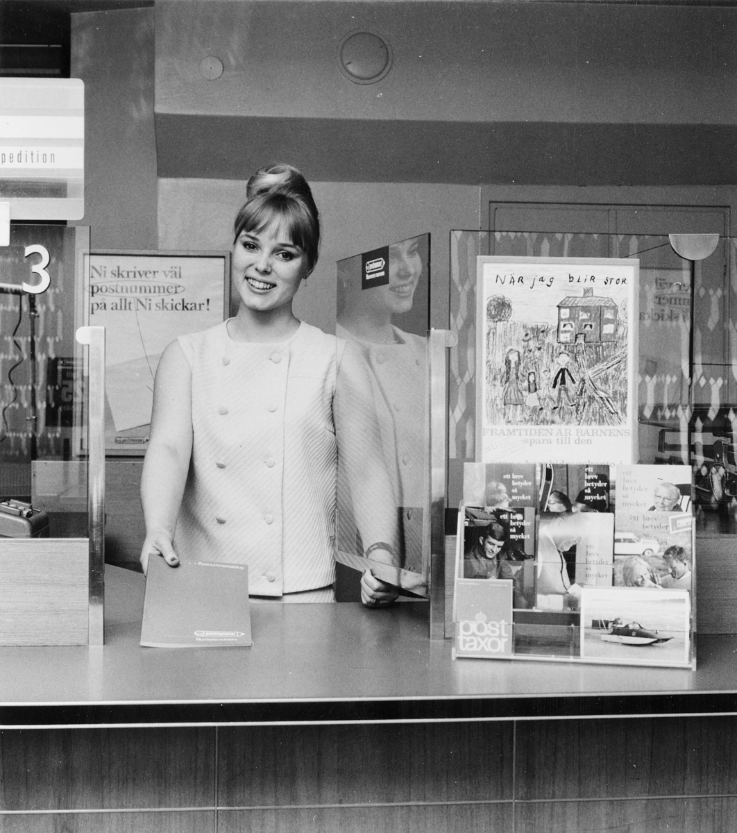 Postkassör Harriet Åhlstedt i en kassa på postexpeditionen Danderyd 2, Nora Torg, lämnar ut den nya postnummer-katalogen.