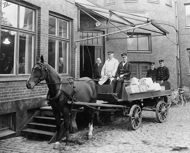 Hästtransportvagn för lokala posttransporter. Utanför postkontoret