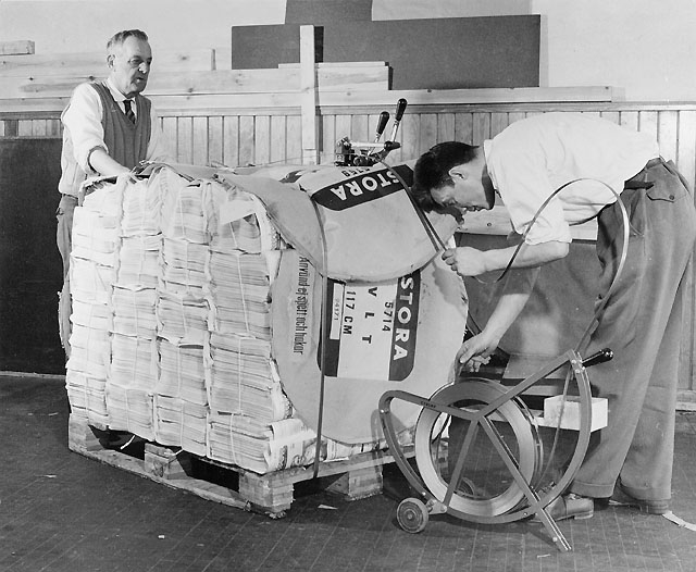 Bandning av pallast på ICA-kurirens distributionsavdelning.