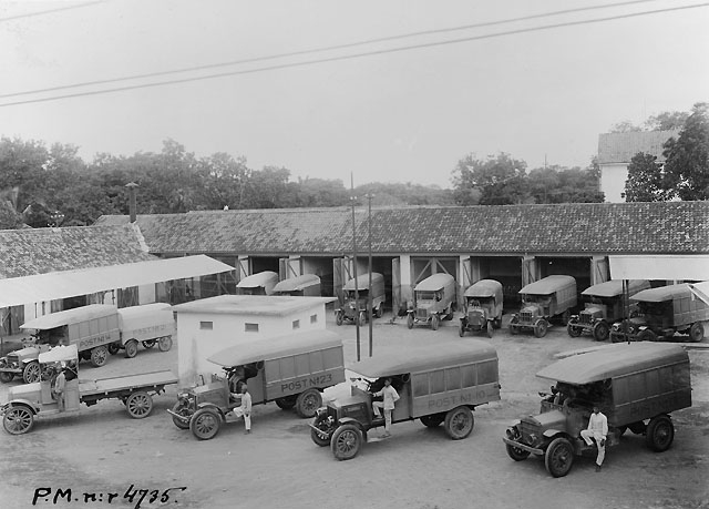 Postbilgarage vid Pasar Baru (Weltevreden). Bilarna används för lokala
