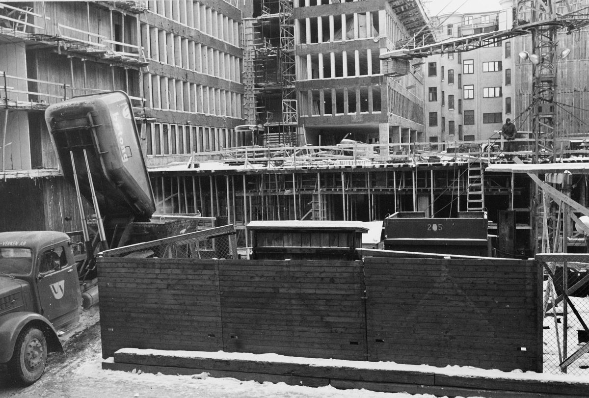 Husets Rådmansgatan 65 bottenvåning, i förgrunden och i fonden Postbankshusets centrumdel.