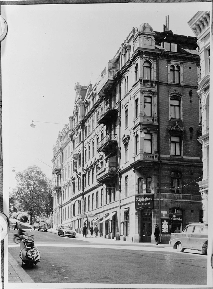 Hörnhuset Drottninggatan-Tegnérgatan före rivningen. Fasaden mot Tegnérgatan. I fonden skymtar Tegnérlunden. I hörnet Aspingtons välkända antikvariat. Foto 1959.