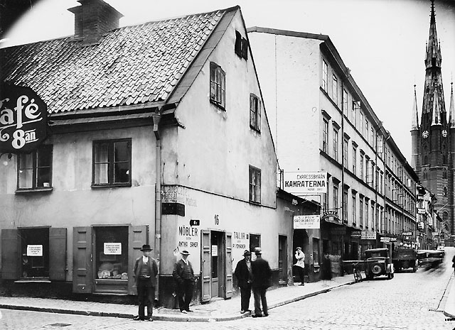 Hörnet av Bryggargatan (t.v.) och Klara Norra Kyrkogata. I fonden