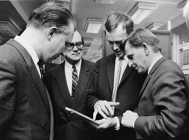 Civilingenjör Erland Persson demonstrerar - med hjälp av ett kretskort - hur Postgirots optiska läsare fungerar. Lyssnar gör, fr v, Nils Hörjel, Nils-Olov Hasslev och statsrådet Palme.