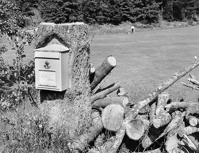 Brevlåda, intill Lidingö golfbana, vid Harrvägen - Rödstuguvägen - Kyttingevägen.