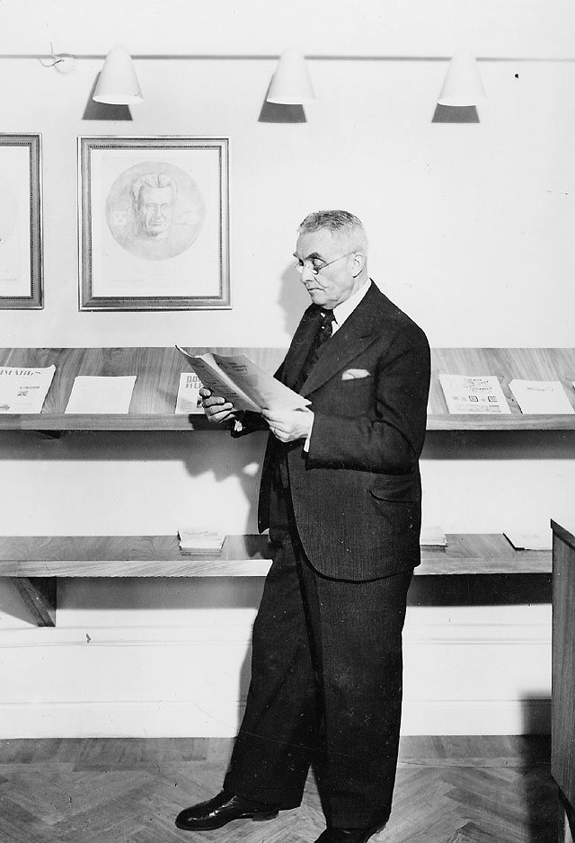 Titel: Direktör Nils Strandell i filatelistiska bibliotekets läsrum.