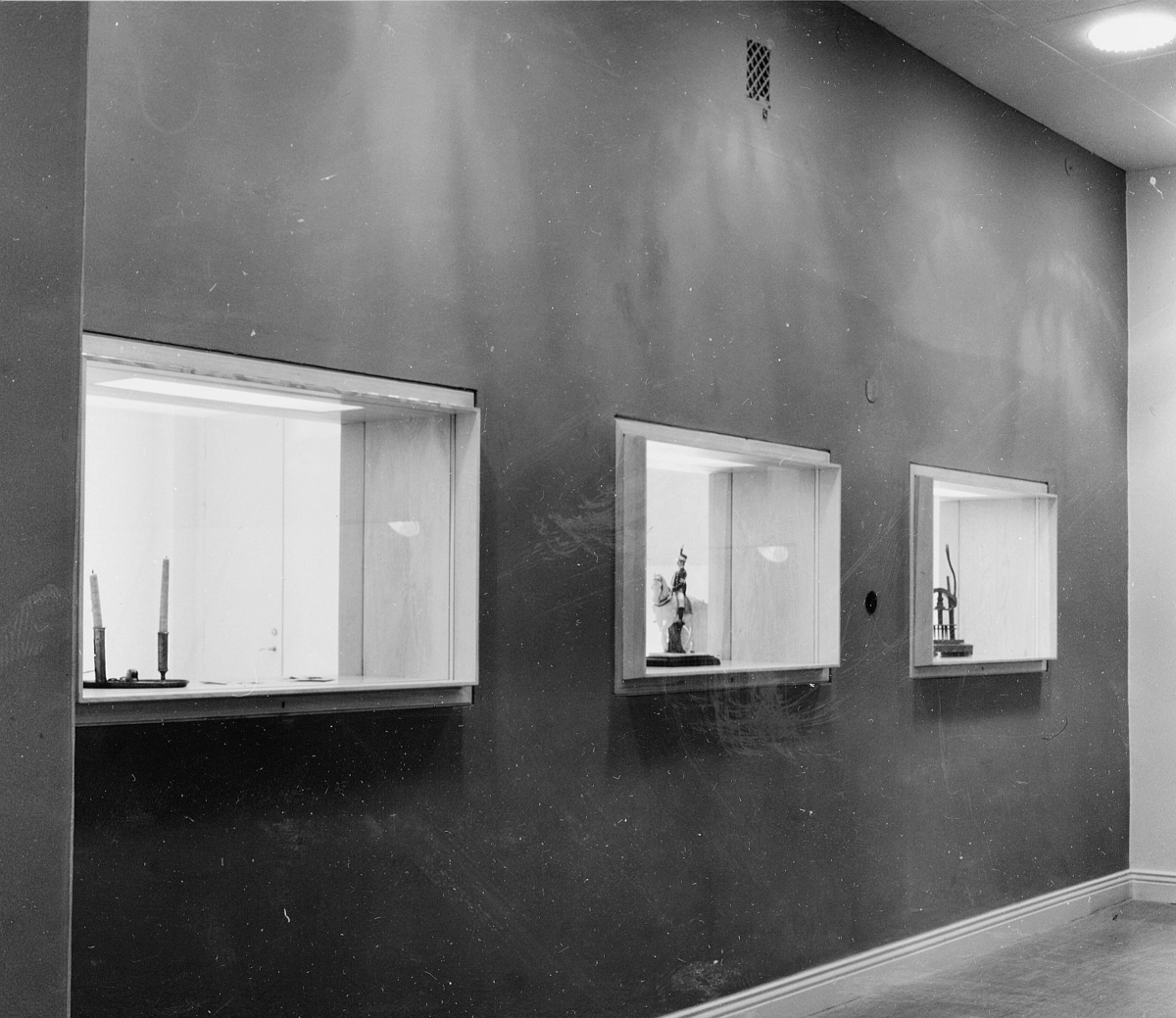 Fönster mot trapphallen, med utställningsföremål.