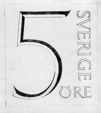 Förslagsskisser till frimärket Ny Siffertyp 1951 - 1965, utgivet 29/11 1951. Konstnär: Karl-Erik Forsberg. Foton 30/5 1967. Blyerts. Texterna "Sverige" lodrätt till höger, och "öre" nedtill. Valör 5 öre