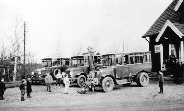Titel: Linjerna Sollefteå - Strömsund - Jormlien - Ankarede. Tre postdiligenser utställda på en vändplan.
