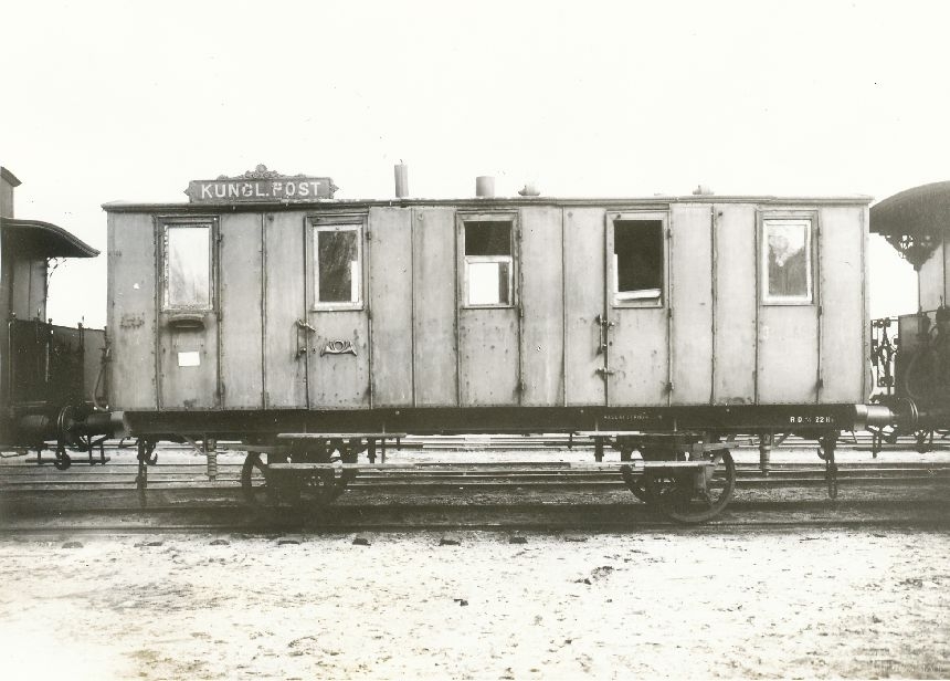 Fotografi föreställande postvagn Litt CD nr 17 vid järnvägslinjen Kristianstad-Hässleholm, 1920-tal.