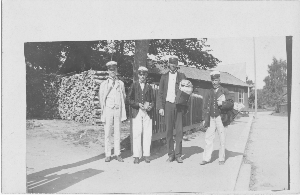 Vykort med brevbärarna, från vänster: Emanuel Eriksson, Sven Elg, Johan (John) Hellmér och Ernst W Ekberg.