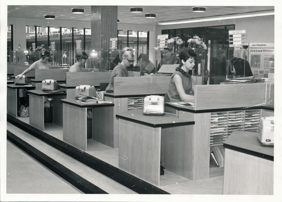 Interiören vid kassadiskarna vid Lunds Postkontor, 1967.
