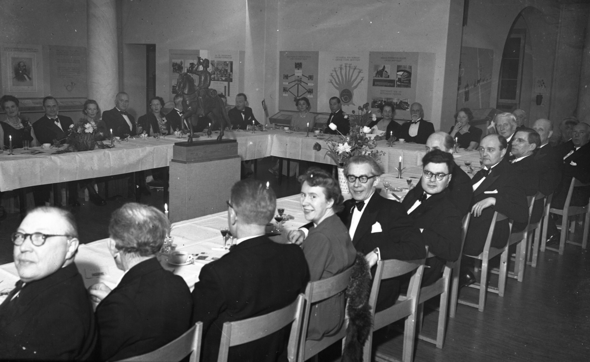 Kungliga Generalpoststyrelsens och Postmusei Vänners middag den 20 april 1951 i samband med den schweiziska frimärksutställningen i Postmuseum.