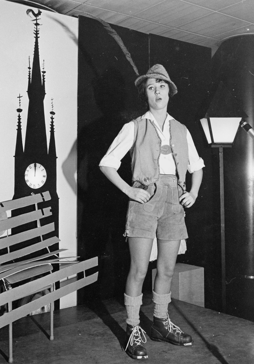 En av bankens egna förmågor, Ros-Mari Liljegren, sjunger iförd tyrolerkostymering.