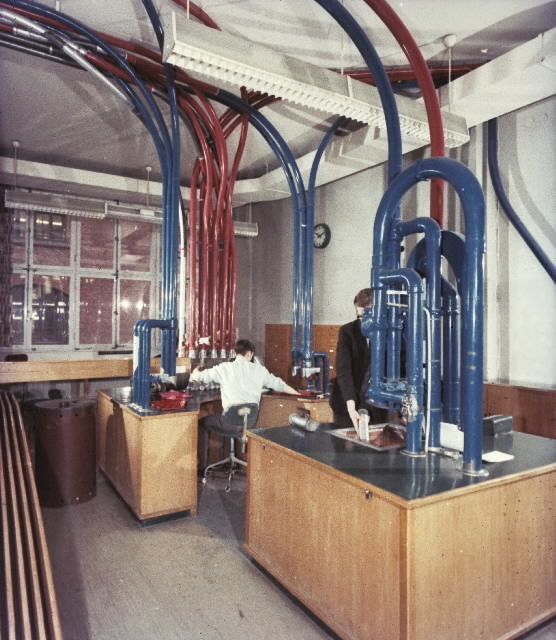 Postgirots rörpostsystem. Centralen i bottenvåningen, där rörposten