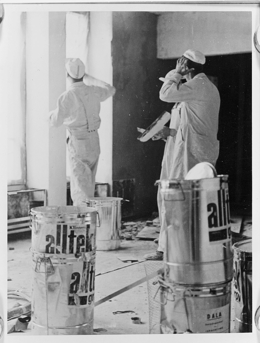 Titel: Måleriarbete i nya Postbankshuset. Foto 1963.